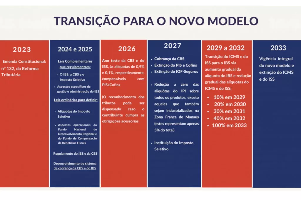 - CBS: fase de testes em 2026, implantação plena a partir de 2027 (substitui PIS/Cofins).