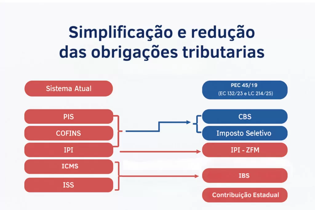 - Menos tributos, novo desenho: 5 viram 2, mas com apuração eletrônica unificada e crédito mais abrangente (até sobre bens de uso e consumo, conforme regras).